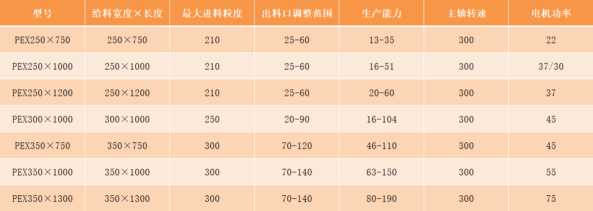 PEX系列細碎顎式破碎機型號及技術參數: